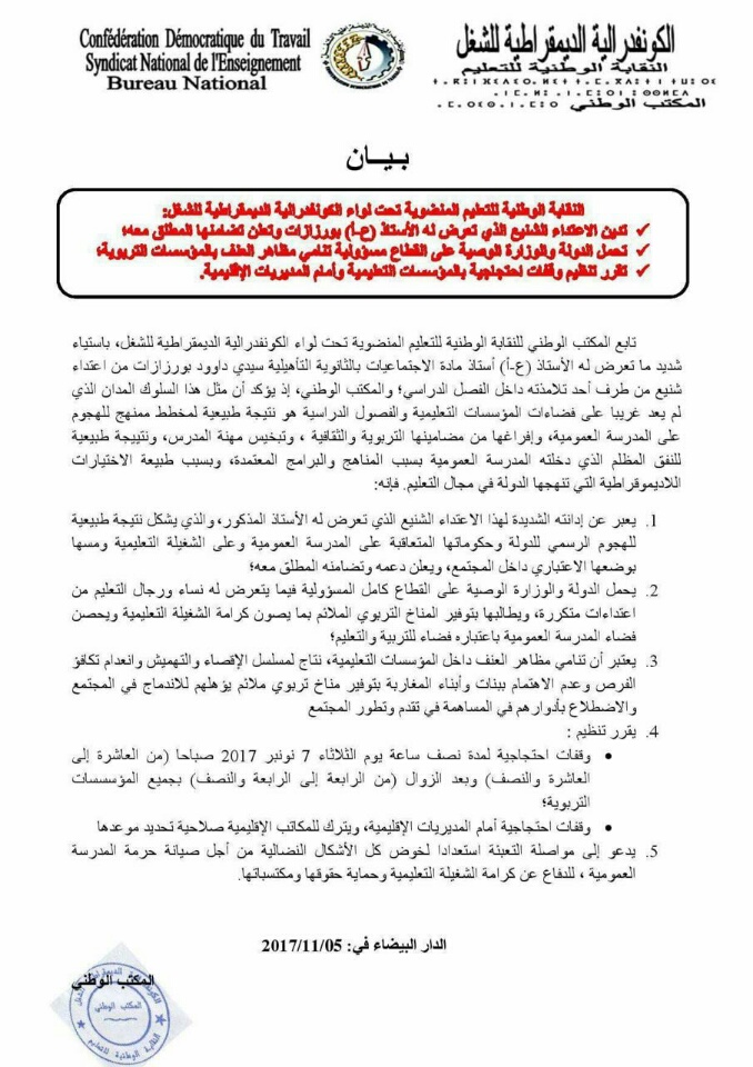 احتجاجا و تضامنا مع أستاذ ورزازات النقابة الوطنية للتعليم/CDT تنظم وقفات احتجاجية أمام المدارس و بالمديريات الإقليمية